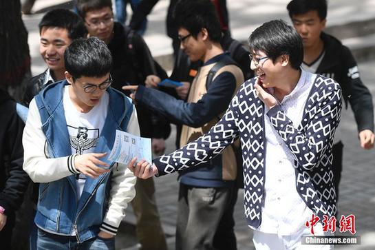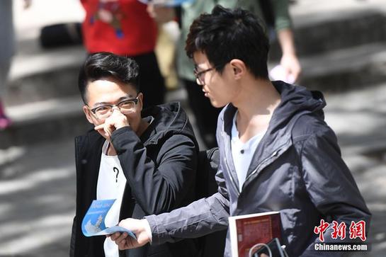 4月18日,山西太原科技大学校园内,山西省人类精子库的工作人员向大学生发放捐精科普材料,鼓励年轻健康的男同学踊跃参加这项公益活动,大学男生看到传单后纷纷露出羞涩的笑容。韦亮摄