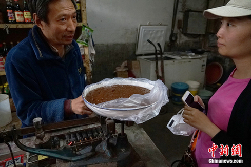 卖酱料的同时,老板还跟顾客传授手艺,告诉她酱料怎么做才好吃。这名顾客从北京西四环专门打车过来买酱,她说家人嘱托自己多买点,只有这里的酱才能吃出最正宗的老北京味儿。她自己也非常喜欢闻酱的味道,说是自己小时候的味道。中新网记者 李卿 摄