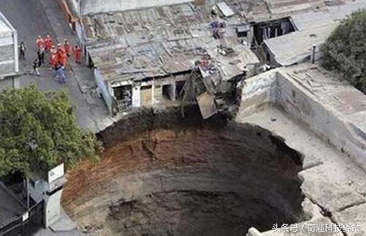8、危地马拉污水池洞 2007年,危地马拉突然出现地面塌方,十几处房屋瞬间落入一个300英尺深的污水池洞,从而导致2人死亡,数千人被迫撤离该区域。这个塌方的污水池是由于雨水和地下污水流动造成的。