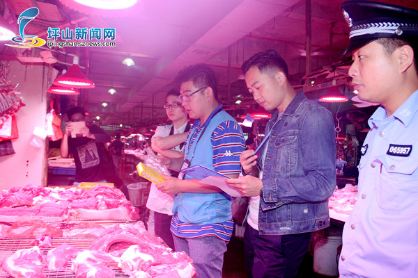 当天上午,市市场和质量监管委坪山局联合市质量检测院、公安部门,前往坪山综合市场、江岭市场和新又多超市坑梓店,对媒体报道的不合格样品的猪肉档位、蔬菜档位进行抽样检测,共抽取猪肉样品2批次,蔬菜13批次在抽样过程中,执法人员对猪肉的来源、索证索票,蔬菜的来源、进场检测等情况一一进行了细致检查,并现场制作执法文书由当事人签名确认。