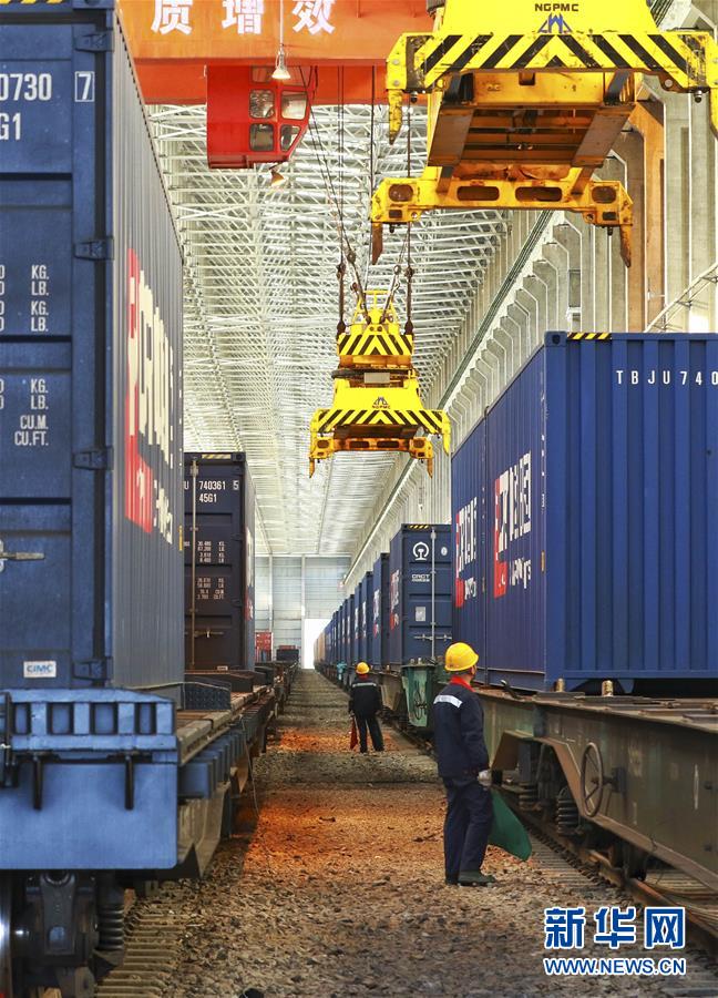 当地铁路部门工作人员在换装车库内给首趟中欧班列(伦敦-义乌)换装(4月24日摄)。 新华社发(张永恒 摄)