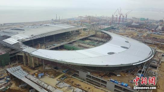 5月3日,港珠澳大桥珠海口岸旅检大楼合龙。一桥连通三地气势如虹,人工岛秀美,旅检大楼蔚为壮观,格力地产、中建钢构、中建三局、广东长大等建设者为大桥工程建设砥砺奋战,初现端容,离通车目标更近了一步。图为港珠澳大桥珠海口岸旅检大楼。中新社记者 陈文 摄