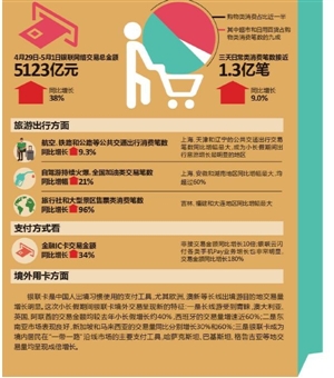 据新华社电 中国银联发布的数据显示,4月29日至5月1日三天,银联网络交易总金额达到5123亿元,相比去年“五一”假期增长38%。