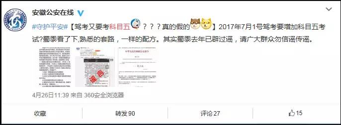 近日,一则有关 “驾考新规”的消息在微博、微信中得到大量转发。尤其是网传内容中“2017年7月1日起将增加科目五考试”的“规定”引发众多网民热议。对此,山东、青海等多地交警部门均辟谣称,该消息不实。