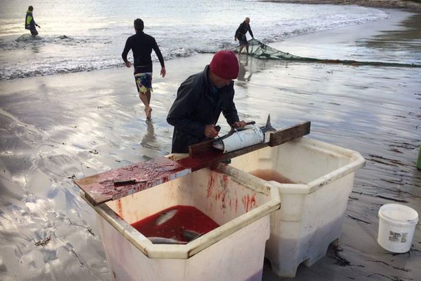 这里泛滥的三文鱼,肉体是红色的,腥味比较重,澳洲厨师培训时用的都是养殖鱼,碰到这种野味,完全不知道怎么处理。结果就是怎么做也不好吃,放在菜单上也没人点,久而久之澳洲人对这些野生三文鱼全部失去兴趣了。图为渔民在处理野生三文鱼。