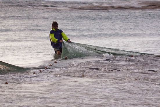 自80年代当地最后的食品加工厂关闭以来,这里的渔业捕捞量从平均一个季节3000吨,下降到75吨至300吨。因为野生三文鱼数量太多,已经影响到野生龙虾的繁衍,所以当地渔民以50美分(约合3.5元)一公斤的价格出售三文鱼,用作龙虾饵料。图为当地渔民捕捞三文鱼。