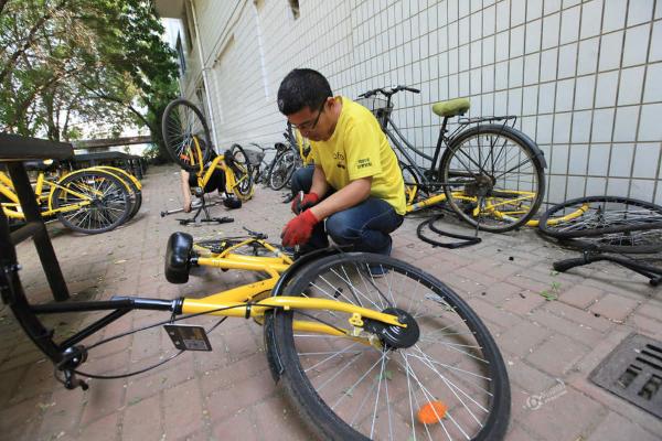 维修点的修车师傅正在修复已经损坏的小黄车。