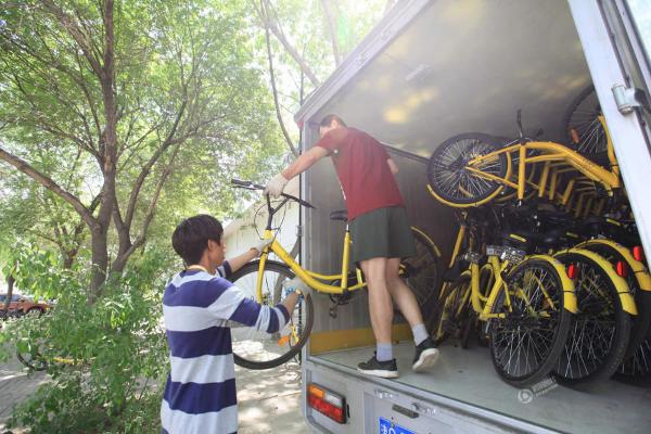 维修点的工作人员将修理好的小黄车搬上车运往停放点。