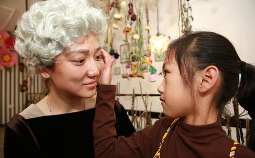 图为一位妈妈化妆变老后,孩子抚摸妈妈额头的皱纹。