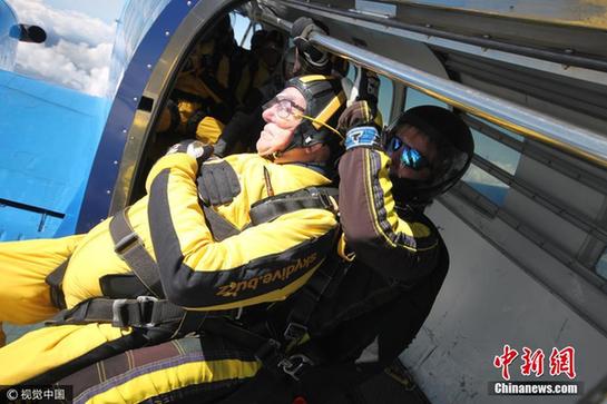 在100岁时首次成功跳伞,其后再接再厉,决意打破加拿大人金德鲁于2013年创下、以101岁零3日高龄完成跳伞的世界纪录。图片来源:视觉中国