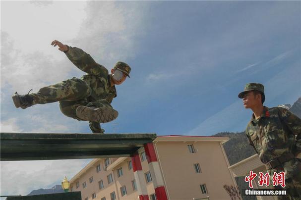 5月中旬,武警甘肃陇南市森林支队抽调基层官兵在甘南藏族自治州迭部县高海拔地区进行强化训练,锻炼官兵爆发力、耐力、身体柔韧性及平衡性,并通过此项训练培养官兵坚韧不拔的意志力。图为战士飞跃高板跳台。李靠军 摄