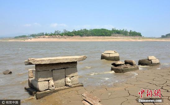 2017年5月15日,近两年,山东威海区域降水量偏少,许多水库水位下降严重,位于荣成市的后龙河水库便是其中之一。5月13日,荣成文物专家张启明向记者透露,1958年因水库蓄水淹没于后龙河水库的大片古墓群重见天日。该古墓群为石制,与国家级文物保护单位荣成留村墓群类似,或产生于金元时期。已露出水面的石墓有14座,水中还有10余座。图片来源:视觉中国