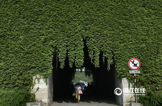 市民在被爬山虎植物覆盖的南京古城墙城门洞里纳凉避暑。