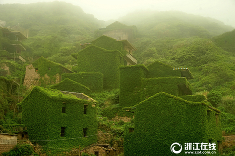 舟山一个无人居住的荒村,村落荒芜,许多无人居住的房屋逐渐被大自然侵蚀,布满爬墙虎,宛如绿色童话世界。