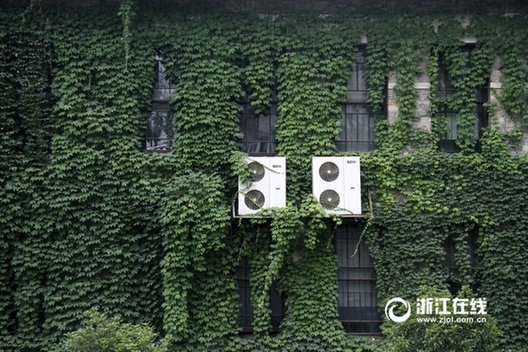 2017年5月11日,湖州市南浔区菱湖镇的一座厂区里,密密麻麻的爬山虎将老旧的房屋和水塔装扮得一片碧绿,宛如一座“绿色城堡”。