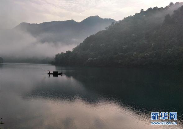 5月17日,在湖南资兴市东江湖,一名渔民在湖面撒网。当日清晨,湖南郴州资兴市东江湖湖面水汽弥漫,飘逸的薄雾和摇橹的轻舟构成一幅水墨画。新华社发(吴勇兵 摄)