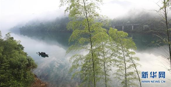5月17日,在湖南资兴市东江湖,一名渔民在湖面撒网。当日清晨,湖南郴州资兴市东江湖湖面水汽弥漫,飘逸的薄雾和摇橹的轻舟构成一幅水墨画。新华社发(吴勇兵 摄)