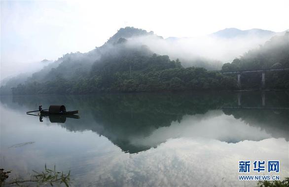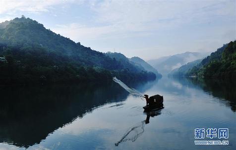 5月17日,在湖南资兴市东江湖,一名渔民在湖面撒网。当日清晨,湖南郴州资兴市东江湖湖面水汽弥漫,飘逸的薄雾和摇橹的轻舟构成一幅水墨画。新华社发(彭斌 摄)