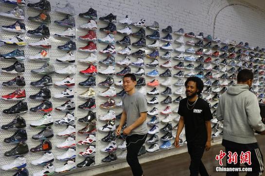 当地时间5月16日,马克菲特展示即将发往中国的货物。马克菲特的潮鞋店名为StadiumGoods,位于纽约曼哈顿SOHO商业区,该店运动鞋和街头服饰齐全同时面向收藏者服务。马克菲特去年8月将店铺入驻淘宝网天猫国际后,目前通过互联网面向中国消费者的销售额已达数百万美元,他们每天通过天猫国际向中国发货数百双。中新社记者 廖攀 摄