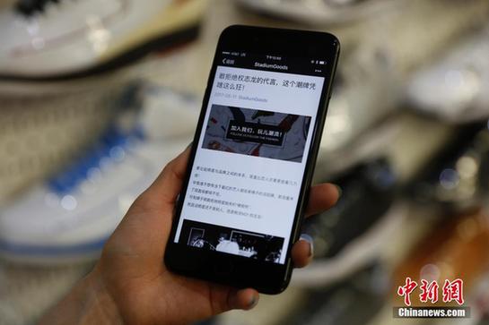 当地时间5月16日,马克菲特在微信注册了自己店铺的公众号,向中国消费者介绍店铺商品。马克菲特的潮鞋店名为StadiumGoods,位于纽约曼哈顿SOHO商业区,该店运动鞋和街头服饰齐全同时面向收藏者服务。马克菲特去年8月将店铺入驻淘宝网天猫国际后,目前通过互联网面向中国消费者的销售额已达数百万美元,他们每天通过天猫国际向中国发货数百双。中新社记者 廖攀 摄