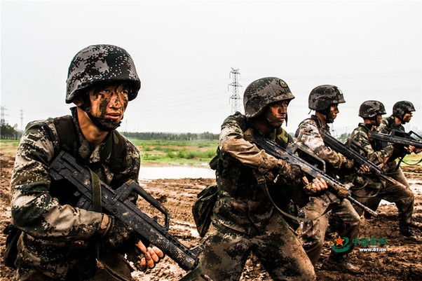 风雨泥泞中,黝黑的脸庞和无畏的眼神都在诉说着军人的刚强。