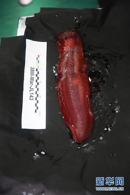 这是5月23日拍摄的“蛟龙”号在马里亚纳海沟带回的生物样品海参。