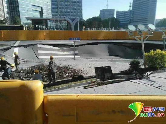 相关单位正在抢修,塌陷路段已被用挡板隔离开。 记者 李永鹏 实习记者 蒋艳慧 图片来源:中国青年网