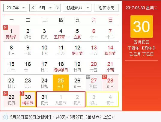 端午节假期是5月28日~30日放假调休,共3天。千万别忘了,5月27日(星期六)是要上班的。