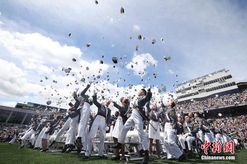 936名军校学员经过四年学习后毕业,学员们入场参加毕业典礼,按照惯例,学员们向空中抛军帽庆祝顺利毕业。