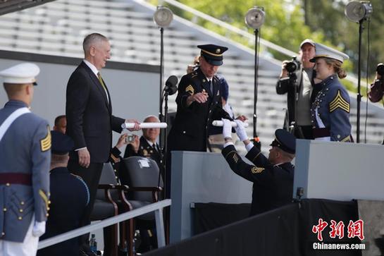 美国国防部长马蒂斯(左二)为西点军校学员颁发毕业证书。