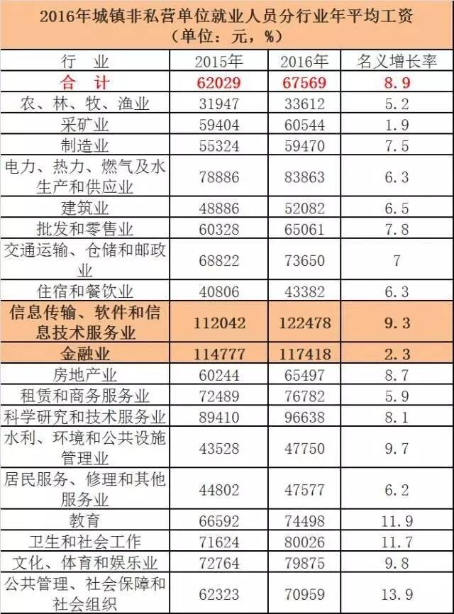 2016年城镇非私营单位职工年平均工资数据显示,信息传输、软件和信息技术服务业持续快速发展,平均工资为122478元 ,比上年增长9.3%,平均工资水平首次超过金融业排名各行业门类 首位。