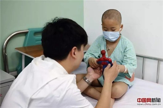 2017年5月24日,北京首都儿科研究所,男护士季长绪给白血病患儿天佑一个蜘蛛侠玩具。刚入院时一天要抽血数次,给年幼的天佑造成阴影。“他天天就想着这个事,经常说‘妈妈,我是不是还要抽血?’”天佑的母亲海燕说。看到孩子的低迷,知道天佑喜欢“蜘蛛侠”的季长绪,给孩子送了这个玩具,希望能鼓励他勇敢接受治疗。