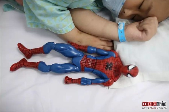 2017年5月24日,北京首都儿科研究所,天佑把“蜘蛛侠”玩具放在身边,躺着睡觉。天佑得的是急性淋巴细胞白血病B型,这种类型的白血病治愈率很高的,有六七成把握。随着医学发展,白血病已经不是不治之症,通过化疗、造血干细胞移植等治疗措施,80%-90%的儿童白血病可以缓解,60%-70%的可以治愈。
