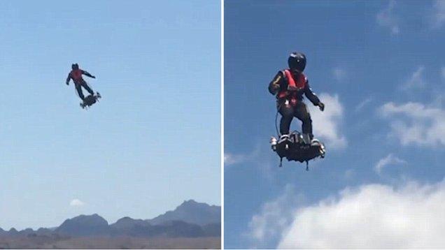 法国发明家、原水上摩托艇冠军弗兰克-萨帕塔(Franky Zapata)以发明“空中飞行板”技术闻名于世。5月初,他在位于美国亚利桑那州的哈瓦苏湖试飞了最新一代“飞板”。图为本月初,这位37岁的前冠军在哈瓦苏湖试飞新型喷气“飞板”。