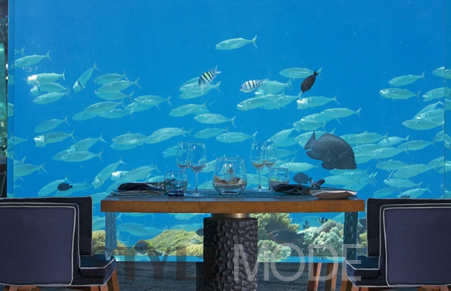 SEA餐厅位于海底,从窗边的餐桌可360度观赏当地海洋生物的景色,红珊瑚和海扇珊瑚温柔摇曳,鲨鱼、海龟穿梭其中。餐厅所在位置也是该地区最好的水肺潜水点。