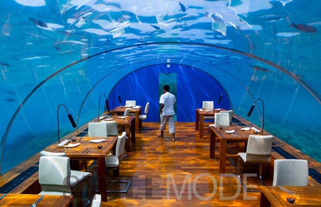 Ithaa餐厅位于马尔代夫港丽岛(Rangali Island)附近的水下五米。犹如纯净的绿松石般的海面下,珊瑚花园环绕其间,抬头就是各种鱼儿游弋的全景天花板。这家餐厅面积不大,但是非常出名,最好提前预约,还有带好相机。