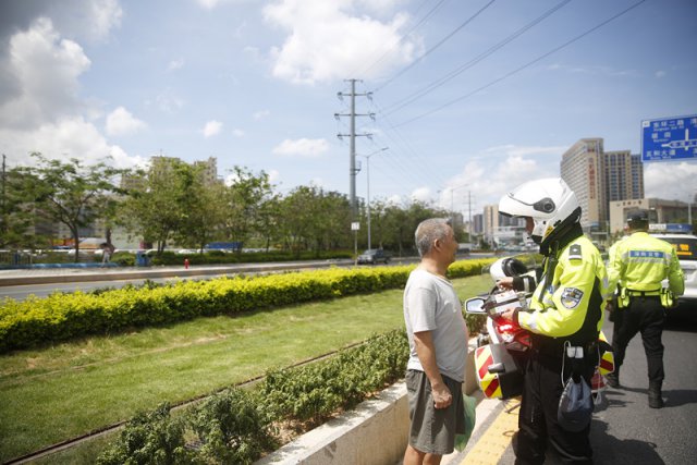 6 月上午 10 时许,记者跟随龙华交警大队刚行至有轨电车沿线碧澜站附近,只见一名年约三四十岁的男子径直来到路边小跑穿过电车轨道。交警当即拦住了男子,对他进行了批评教育,并根据相关规定对其处以 20 元罚款。