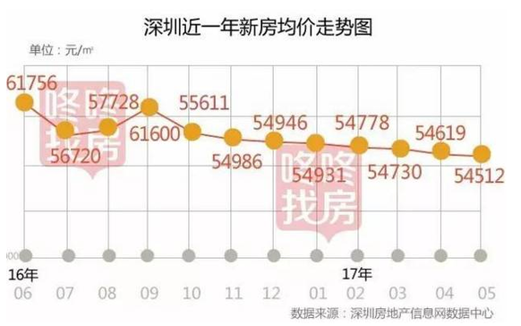 根据市规土委数据,5月一手住宅成交价格54512元/平方米,环比再度下跌0.2%。5月是连续7个月处于5.5万元/平方米的水平,截至目前深圳房价已经连续8个月下跌,与2016年9月的61600元/平方米相比,房价已下跌7088元/平方米。
