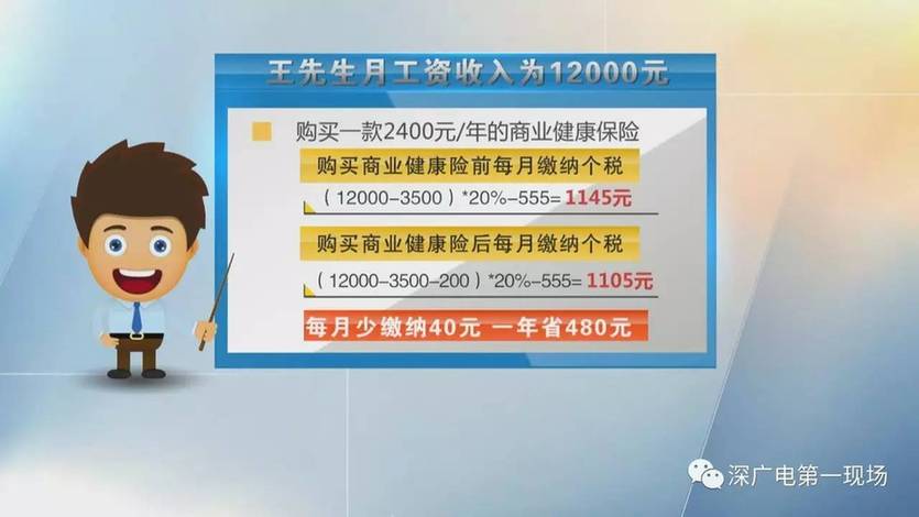通知显示,市民在购买商业健康保险产品后,予以税前扣除,扣除限额2400元/年,也就是200元/月。以市民王先生为例,在扣除三险一金以后,每个月工资收入12000元,他想购买一款2400元/年的商业健康保险。算下来,购买商业健康险前每月缴纳个税1145元个税,购买商业健康险后每月缴纳个税1105元,相当于每月省下40元,一年省下480元。深圳市地税局税务二处工作人员龙渊泓:按照额度来扣除,工资越高扣除越多,那么把2400元/年额度用到最高的话,一年能省下1000多元。