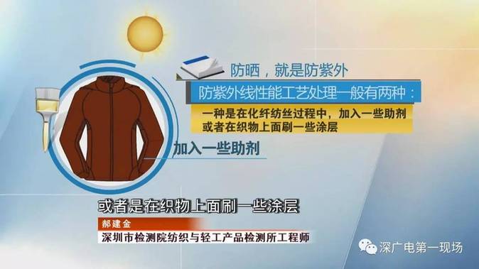 其实防晒,就是防紫外。不能仅凭商家的口头宣传,我们就轻信是防紫外线功能的。防紫外线性能工艺处理一般有两种:一种是在化纤纺丝过程中,加入一些助剂,或者在织物上面刷一些涂层。