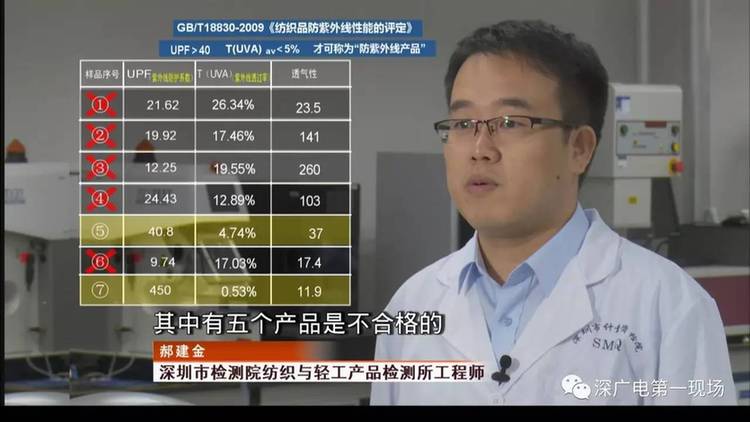 深圳市计量质量检测研究院纺织与轻工产品检测所工程师郝建金:我们对商家宣称是防晒服的七个样品,按照国家的相关标准,进行了防紫外线性能的检测。结果七个样品中,有五个是不合格的。也就是说,它们是不具备防紫外线性能的。