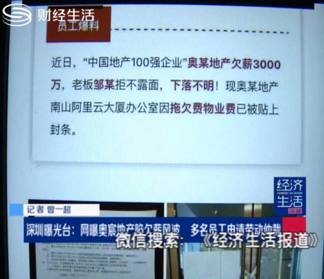 多个网贴转载了“深圳某百强房企办公场所被封,网传欠薪3000,老板去向不明的事情,这里的百强房企就是指的就是奥宸地产,那么,网贴所说的到底是不是实情?我们的记者也进行了一番现场调查。