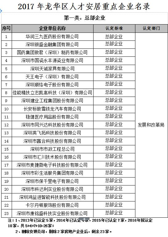 6月19日,龙华住建局网站公布《2017年龙华区人才安居重点企业名录》(共419家,见下表),目前处于公示期。若公示通过,公司员工将有机会租赁到由政府定向配租的公租房,快 看看有没有你所在的企业~