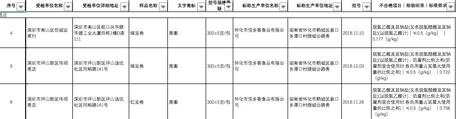 南山区创城达商行的绿豆卷脱氢乙酸及其钠盐不合格;
