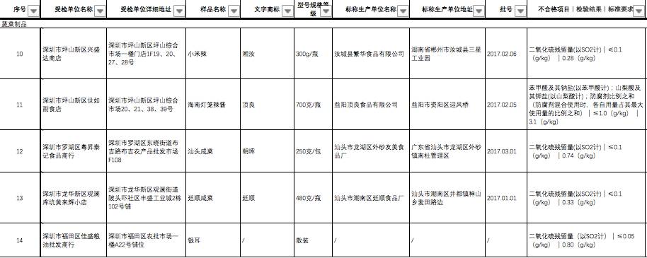 罗湖区粤昇泰记食品商行的汕头咸菜,二氧化硫残留量不合格;