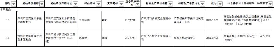 宝安区西乡星星副食商行的九制杨梅,环己基氨基磺酸钠不合格。