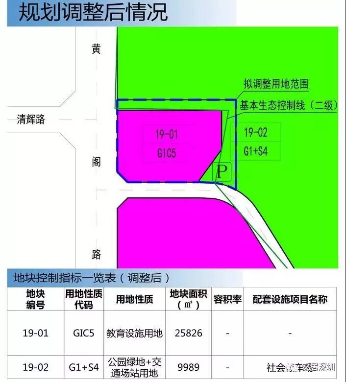 将19-01及19-02地块部分用地进行优化调整。调整后,19-01地块规划为教育设施用地(GIC5),用地面积25826平方米;19-02地块规划为公园绿地交通场站用地(G1 S4),用地面积9989平方米,配建社会停车场。