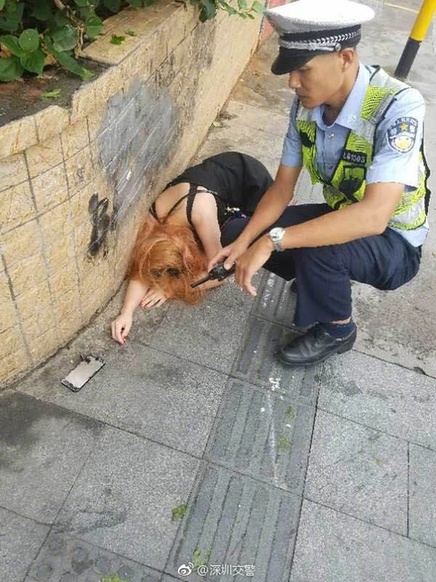 @深圳龙岗交警大队辅警在龙岗大道碧新路口执勤时发现辅道有一名女子睡在地上,立即前往查看,这名女子浑身酒气,不醒人事。经过多次呼叫后该女子迷迷糊糊睁眼就开始哭闹,称因感情问题喝醉酒。(来自:深圳龙岗交警)