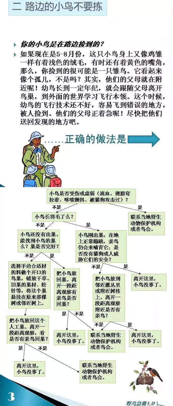 蒲颖说,市民应该确认该幼鸟是否受伤或虚弱,如果是,应该联系当地野生动物保护机构或观鸟协会,如果不是,要尽快把它们送回到发现的地方。假如小幼鸟有受到其他动物的威胁,可以把小鸟放到附近灌丛或附近树枝,离开一段距离观察附近是否有亲鸟。如果小鸟还没有长羽毛,则应该把小鸟放回巢,假如没有巢,可以选择手边合适材料制作开口的鸟巢,铺放干草,将巢悬挂在原来或临近的树上,把小幼鸟放回人工巢,离开一段距离观察附近是否有亲鸟。上述情况如没有亲鸟,则应该联系当地野生动物保护机构或观鸟协会。