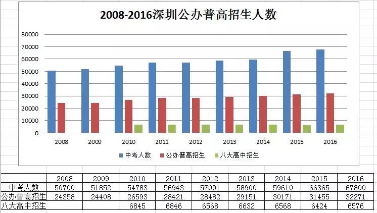 从下图中可以看到,深圳中考报考人数不断增加,但是公办普高的招生计划人数还不到报考中考人数的一半,而可以进入八大高中的人数就更少了。